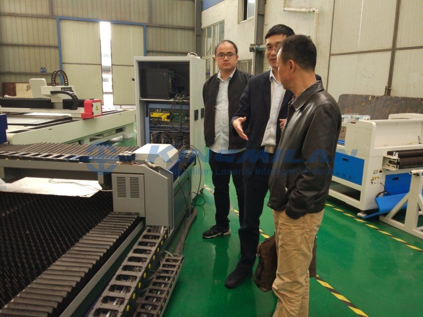上圖,客商了解金米蘭中大功率激光切割設(shè)備! 參觀光纖激光切割機(jī)車間;