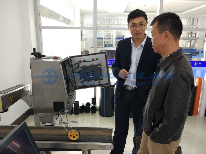 上圖,客商仔細(xì)了解高端激光噴碼機(jī)性能;